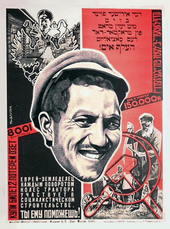 Afiș de propagandă pentru îndreptarea evreilor spre agricultură, 1929. Textul, în rusă și idiș, spune: „Cu fiecare învârtire a roților tractorului, agricultorul evreu contribuie la construirea socialismului.”