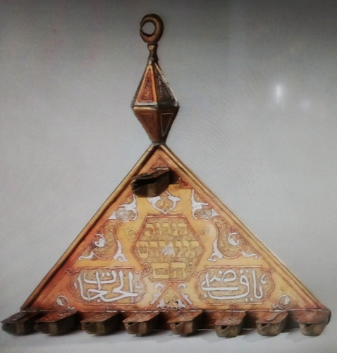 Dacă influența Europei creștine se răsfrânge clar asupra candelabrelor de Hanuka, același lucru se întâmplă și în orientul musulman. Următoarea hanukia provine dintr-o sinagogă din Damasc și are o inscripție din care aflăm că datează din 1925. Interesant că în cazul acesta se păstrează forma clasică, triunghiulară, folosită în Europa medievală. Nu este o piesă scumpă, este făcută din cupru încrustat cu alamă și argint în tehnica numită damaschinare, practicată – evident – la Damasc. Partea care mie mi s-a părut interesantă este că o inscripție ebraică se află alături de una arabă și… nimeni nu se miră! În ebraică scrie „Aceste lumini sunt sacre”, dar, din păcate, pe cea în arabă nu o înțeleg.