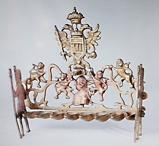 De fapt, ideea de credință monarhiei nu este o excepție. Am văzut încă una, din Viena, care îmbină tablele legii cu vulturul cu două capete, și una din Olanda, ornamentată cu stema orașului Amsterdam. De fapt, în secolele XVIII-XIX, în toată Europa însemnele puterii locale apăreau adesea pe hanukiot. Poate că era un fel de reacție de apărare, ca nu cumva evreii să fie bănuiți de intenții rele…