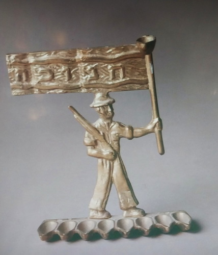 Din Israel aș vrea să dau ca exemplu o hanukia din 1950. Trecuseră abia doi ani de la Războiul de Independență și ornamentația reflectă atmosfera vremii: steagul – aluzie la independență și bărbatul cu mânecile suflecate, gata de muncă, dar și cu arma în mână, gata să-și apere țara.
