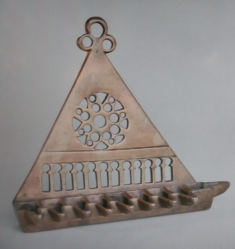 Așadar, cea mai veche hanukia din muzeu datează din anii 1300 și provine din Spania sau poate din sudul Franței. Se vede clar influența arhitecturii medievale: fereastra rotundă, ca cea de pe fațada bisericilor gotice și arcul în potcoavă, folosit de arabii din Spania (și din alte locuri). Este mică, modestă, făcută din bronz și fără ornamentație ostentativă. Îmi închipui că a aparținut unui om necăjit, care, poate că nu o dată, a fost nevoit să plece în pribegie. Dar obiectul de cult a fost păstrat din generație în generație, până în zilele noastre.