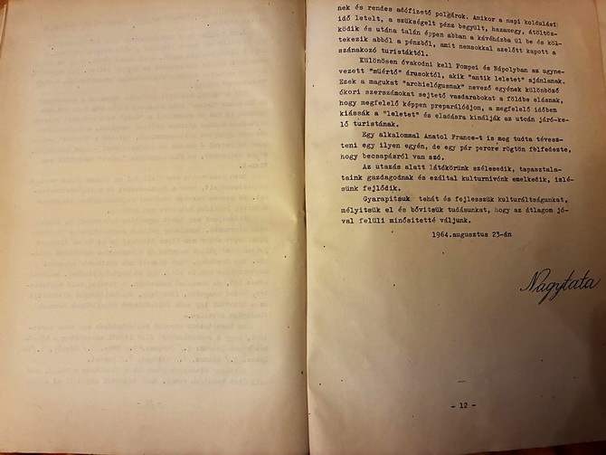 Am şters-o de praf şi am început să răsfoiesc foile format A4, îngălbenite, 12 la număr, dectilografiate pe o singură faţă. Pe prima pagină scrie: ISMERTETÉS JULIKA OLASZORSZÁGI UTAZÁSÁHOZ (Îndrumar pentru călătoria lui Julika în Italia) – Julika fiind prenumele meu utilizat de familia restrânsă şi prietenii din copilărie.