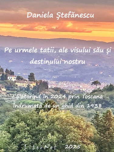 Cartea scrisă de cunoscuta traducătoare şi scriitoare Daniela Ştefănescu[1] se intitulează Pe urmele tatii, ale visului său și destinului nostru – Călătorind în 2024 prin Toscana îndrumată de un ghid din 1938 şi este, de fapt, relatarea unei călătorii complexe în care popasurile de pe meleagurile italiene actuale sunt tot atâtea porţi (sau portaluri) către istoria propriei vieţi, mai exact a timpului când viitorii ei părinţi încă nu se cunoscuseră. Este un pelerinaj inspirat de memoriile scriitorului Mircea Ştefănescu[2], tatăl Danielei, consemnate într-o perioadă de suferinţă trupească şi zbucium sufletesc, când îşi căuta tămăduirea sub cerul însorit al Toscanei, presimţind că în curând avea să-şi întâlnească iubirea vieţii, chiar dacă nu atunci şi nu acolo.