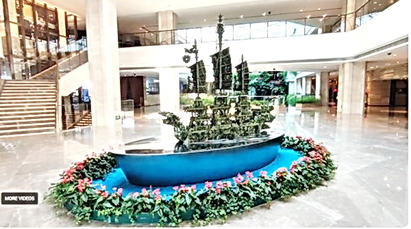 Holul vast este decorat cu artă chineză. Piesa centrală e o corabie monumentală din jad — înaltă cât două etaje și lată de șase metri — pentru că nimic nu spune „bine ai venit, călător de afaceri obosit” mai bine decât un monument maritim din pietre prețioase. Clădirea este modernă, fiecare cameră are televiziune prin cablu, și, ușor surprins, observ că sunt condiții mai bune decât am avut în multe hoteluri din Statele Unite, chiar cu nume celebre.
