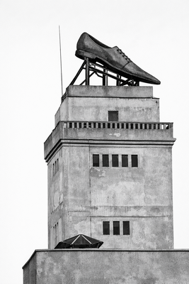 Ridic ochii şi mă loveşte drept în plex imaginea dezolantă, dar încă maiestuoasă, a fostului turn de apă al uzinei, pe acoperişul căruia se află (se mai află!) celebrul pantof de tablă…