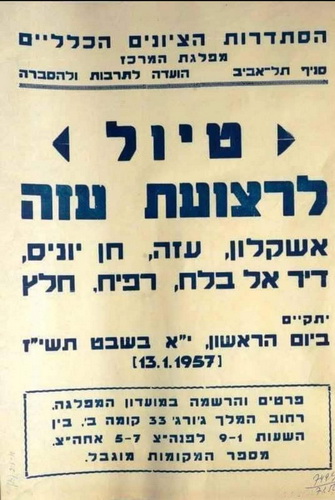 Excursie în Fâșia Gaza: Așkelon, Gaza, Khan Yunis, Dir el Balakh, Rafiach, Halatz va avea loc duminică, 13 ianuarie 1957.