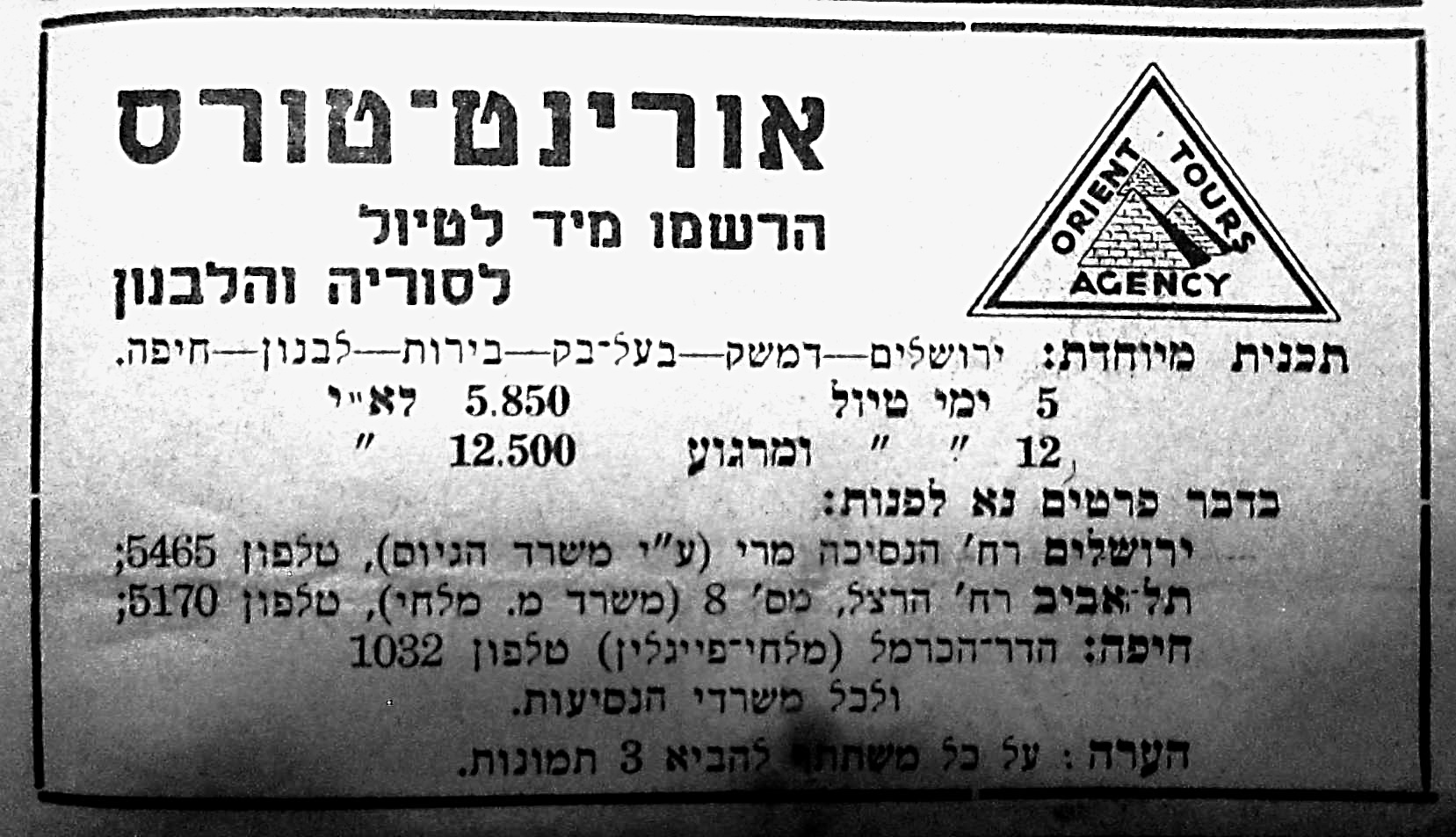 Prețurile sunt acceptabile. Lira Palestiniană mandatară (împărțită în 1000, de aceea apar trei zecimale) era egală cu lira sterlină a vremii. Așadar excursia scurtă ar costa astăzi cca 1540 de șekeli (2250 de lei), iar cea lungă cca 3300 de șekeli (4800 de lei). Dacă aș fi trăit în acele vremuri, oferta mi s-ar fi părut tentantă. Damascul este unul din cele mai vechi orașe din lume, poate chiar mai vechi decât Ierusalimul, trebuie să fi fost o destinație turistică de foarte mare interes, iar Libanul era cunoscut pe vremea aceea ca „Riviera Orientului Mijlociu”.